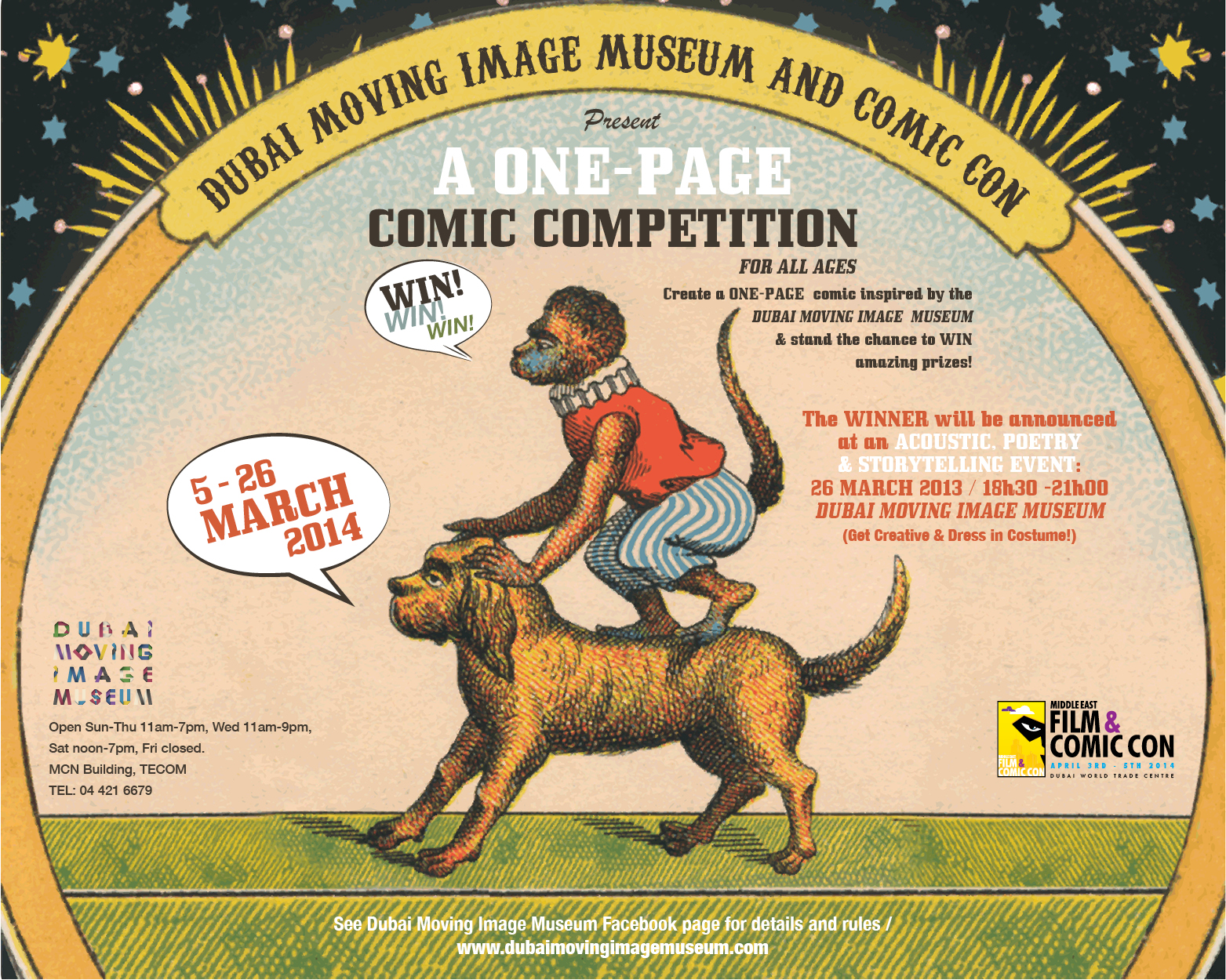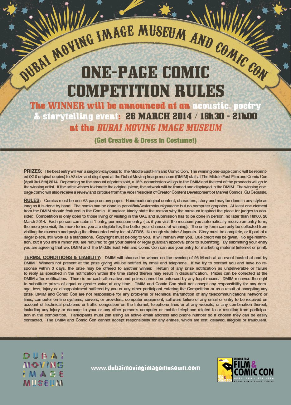 Dubai Moving Image Museum and the Middle East Film and Comic Con present a comic competition for all ages. Create a one-page A3 comic and stand the chance to WIN a 3-day pass to Comic Com 2014 (April 3rd-5th), get promoted by the museum and Comic Con and have your comic reviewed by MARVEL COMICS! Visit the museum at a special rate of AED25 and get your entry. The more you visit the more you can enter!